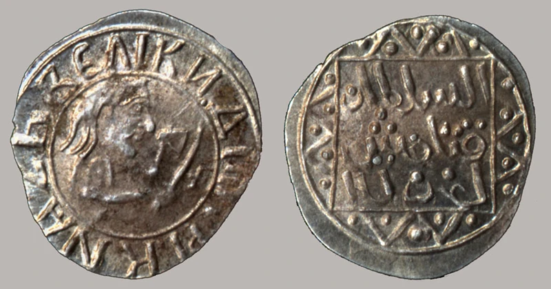 Деньга Дмитрия Донского. Слева — портрет великого князя. Справа — пожелание долголетия «султану Тохтамышу»(на арабском). 1380-е